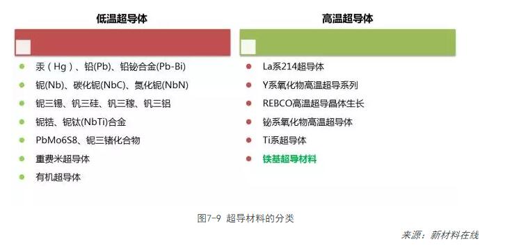 根據組成和轉變溫度的不同,超導材料可分為低溫超導材料和高溫超導材料。低溫超導材料主要有NbTi 和Nb3Sn 材料;高溫超導材料主要有Bi-Sr-Ca-Cu-O(BSCCO)和Y-Ba-Cu-O(YBCO)材料、MgB2超導材料、鐵基超導材料,如圖7-9。