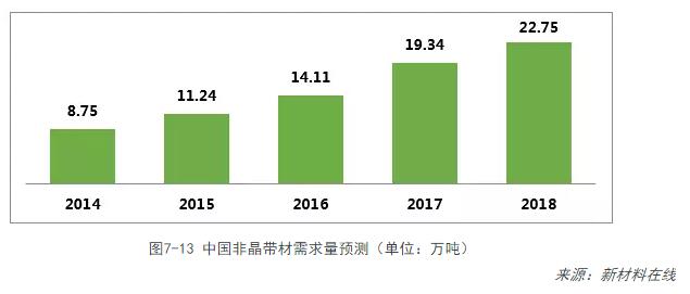 由于非晶變壓器的研發(fā)及應用的快速增長(cháng),非晶帶材也在快速發(fā)展。2014年,國內非晶帶材的銷(xiāo)售量達到6.4萬(wàn)噸,其中日立金屬占了4萬(wàn)噸,安泰科技占了1.5萬(wàn)噸,青島云路為0.8萬(wàn)噸。而2014年,非晶帶材的市場(chǎng)需求量則是8.75萬(wàn)噸,市場(chǎng)嚴重供不應求,供給率為73%,還有27%的市場(chǎng)空間。根據《中國非晶態(tài)合金材料學(xué)術(shù)與產(chǎn)業(yè)化年報2014》,2015年國家電網(wǎng)將主推非晶合金變壓器,力求達到60%,全力推動(dòng)淘汰S9型高耗能變壓器;京津冀一體化發(fā)展,對非晶節能變壓器示范效應將有更大的空間:“一路一帶”也將給非晶更多更大機遇。預計到2018年,預計非晶帶材的市場(chǎng)需求量將達到22.75萬(wàn)噸。