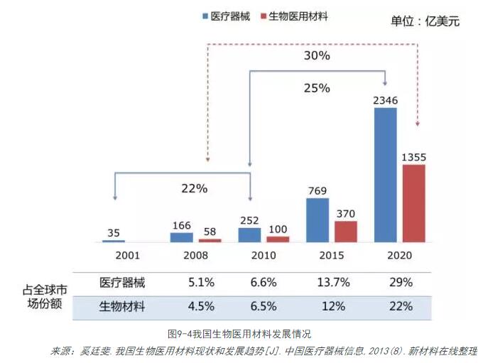 目前,生物醫用材料產(chǎn)業(yè)已成為世界經(jīng)濟中最具生氣的朝陽(yáng)產(chǎn)業(yè)。生物醫用材料產(chǎn)業(yè)以生物技術(shù)和生命科學(xué)為先導,涵蓋醫療衛生、營(yíng)養保健等產(chǎn)業(yè),涉及醫藥產(chǎn)品、保健用品、營(yíng)養食品、醫療器械等多個(gè)與人類(lèi)健康緊密相關(guān)的生產(chǎn)和服務(wù)領(lǐng)域。生物醫用材料產(chǎn)業(yè)的廣闊發(fā)展前景受到世界各國普遍關(guān)注,在一些西方發(fā)達國家已進(jìn)入高速發(fā)展期,成為帶動(dòng)整個(gè)國民經(jīng)濟增長(cháng)的巨大動(dòng)力。它也被聯(lián)合國列為代表人類(lèi)21世紀產(chǎn)業(yè)經(jīng)濟發(fā)展和社會(huì )進(jìn)步的主要產(chǎn)業(yè)之一。隨著(zhù)人們生活水平的提高和生活方式的改變,生物醫用材料產(chǎn)業(yè)具有巨大市場(chǎng)潛力,是國民經(jīng)濟和生物醫用材料產(chǎn)業(yè)發(fā)展的關(guān)鍵。2010年我國生物醫用材料市場(chǎng)銷(xiāo)售額已近100億美元,復合增長(cháng)率為30%。保守估計2015年和2020年年銷(xiāo)售額可分別達到370億美元和1355億美元,10年內成長(cháng)為世界第二大生物醫用材料市場(chǎng)。