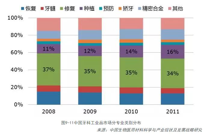 根據中國牙科工業(yè)品市場(chǎng)分布情況看,義齒材料占比穩定,份額最大,而種植牙比重呈持續增加。未來(lái)牙科工業(yè),應重點(diǎn)關(guān)注植入材料和陶瓷材料。2012年,中國年種植體植入量約20萬(wàn)顆,和韓國100萬(wàn)顆及其他周邊國家、地區比,尚有不小的發(fā)展空間。龐大的人口基數,使中國有成為最大的口腔種植市場(chǎng)的潛力。預計到2016年,中國種植牙數量有望上升到50萬(wàn)顆以上,年復增長(cháng)率在30%以上。