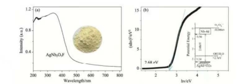 目前,泰坦新材已成功合成光催化劑——AgNb2O5F。AgNb2O5F半導體的能帶寬度為2.68 eV,對可見(jiàn)光具有較好的吸收能力。研究表明,在可見(jiàn)光的照射下,在120 min 內,AgNb2O5F對羅丹明B的光降解率可達90%,反應動(dòng)力學(xué)常數為0.021 min -1; AgNb2O5F對革蘭氏陰性大腸桿菌和金黃色葡萄球菌的抗菌率分別可達96.0%和94.8%;無(wú)光照的情況下,AgNb2O5F對于革蘭氏陰性大腸桿菌和金黃色葡萄球菌均具有一定的抗菌效果,抗菌率分別可達60.4%和78.2%。